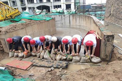防汛演练紧贴实际。首先项目部按照预定方案和针对现场地形,最容易产生积水的车库成为了此次防汛的重点抢险位置。在演练过程中于立功以身作则,冲在防汛最前面,带领工人扛沙袋,设置警戒线,在车库入口做好挡水墙;现场临电电工接通电线,启动移动水泵等抢险设备抽排积水;清淤小组打开雨水篦进行人工助排,快速清理路面淤泥垃圾等,抢险现场各项工作井然有序进行。演练过程中全体人员士气高昂、配合默契、衔接流畅,圆满地完成了防汛应急演练。