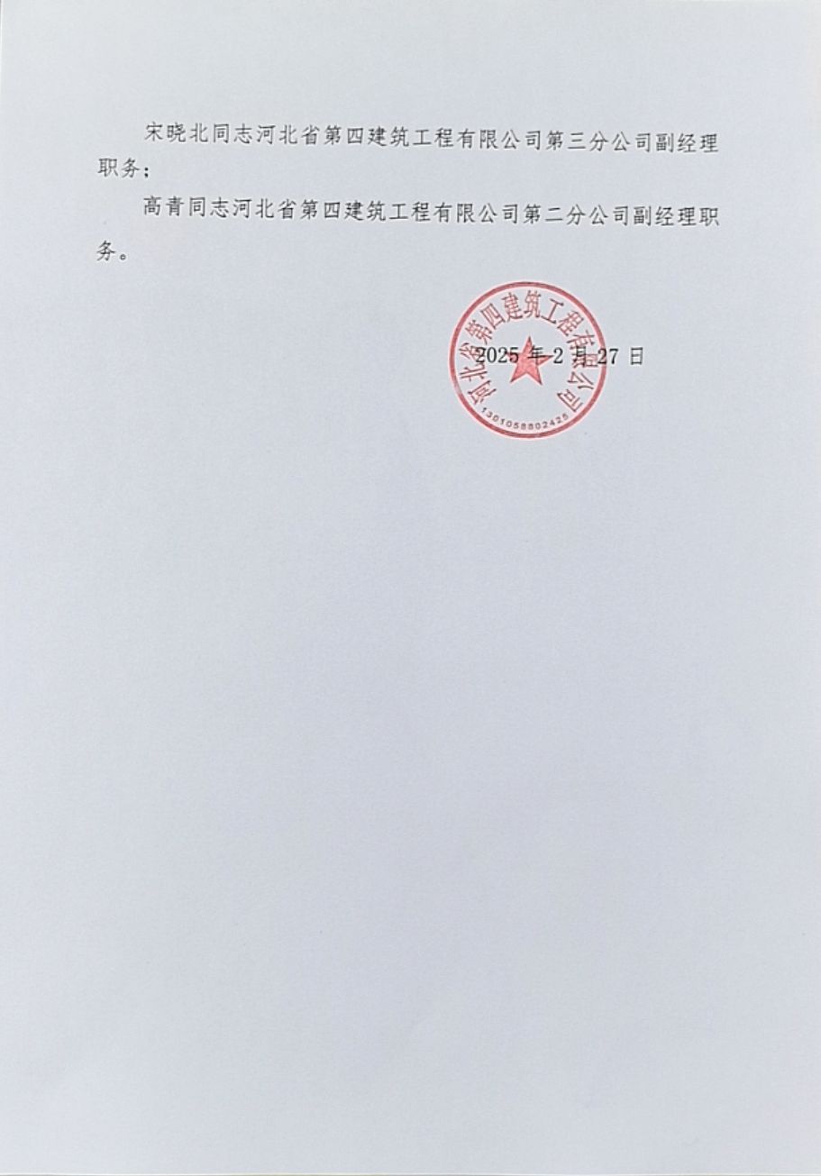 河北四建: 关于杜永山同志正式任职的通知